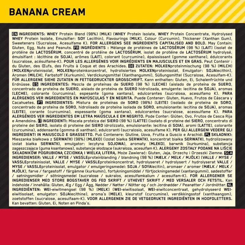 Beljakovinska mešanica SIROTKE (98 %) [MLEKO] (beljakovinski izolat SIROTKE, beljakovinski koncentrat SIROTKE, beljakovinski izolat hidrolizirane SIROTKE, emulgator: SOJIN lecitin), arome, natrijev klorid, sredstvo za zgoščevanje (ksantan gumi), sladilo (sukraloza), barvilo (kurkumin).