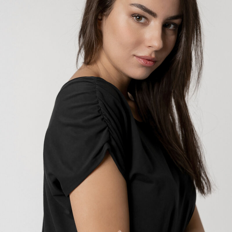 Majica Carole je premišljeno in moderno oblikovana s plisiranimi detajli na ramenih in privlačnimi razporki ob straneh, kar daje vtis zračnosti in elegance. Izdelana iz najboljšega italijanskega materiala, zagotavlja optimalno udobje in vzdržljivost.