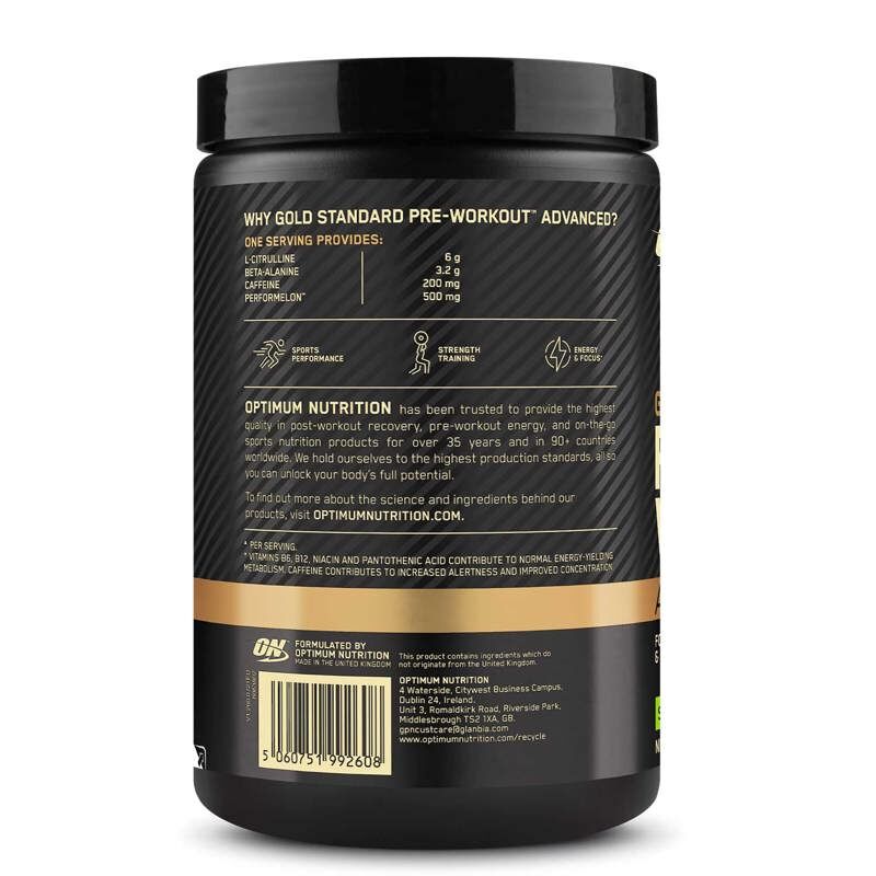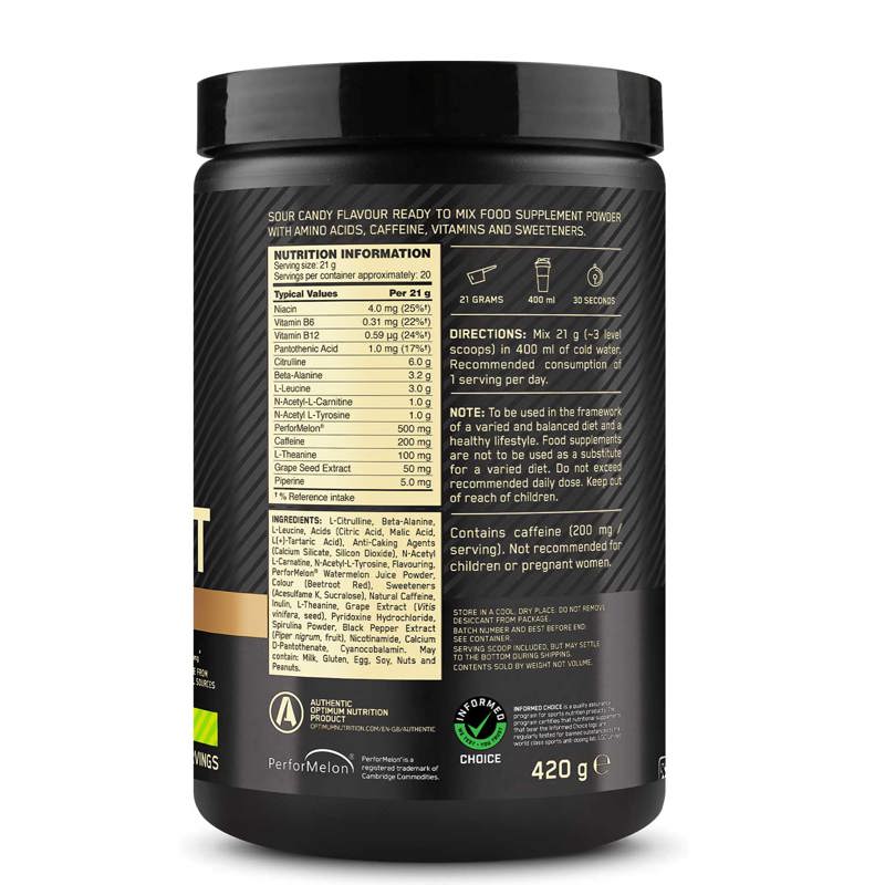 Okus Sour Gummy: L-citrulin, beta-alanin, L-levcin, kisline (citronska kislina, jabolčna kislina, L(+)-vinska kislina), arome, sredstva proti sprijemanju (kalcijev silikat, silicijev dioksid), N-acetil-L-karnitin, N-acetil-L-tirozin, barvilo (rdeča pesa), PerforMelon sok lubenice v prahu, inulin, sladila (acesulfam K, sukraloza), naravni kofein, L-teanin, spirulina v prahu, izvleček grozdja (Vitis vinifera, semena), piridoksin hidroklorid, izvleček črnega popra (Piper nigrum, plodovi), nikotinamid, kalcijev D-pantotenat, cianokobalamin. Lahko vsebuje: mleko, gluten, jajca, sojo, oreščke in arašide.