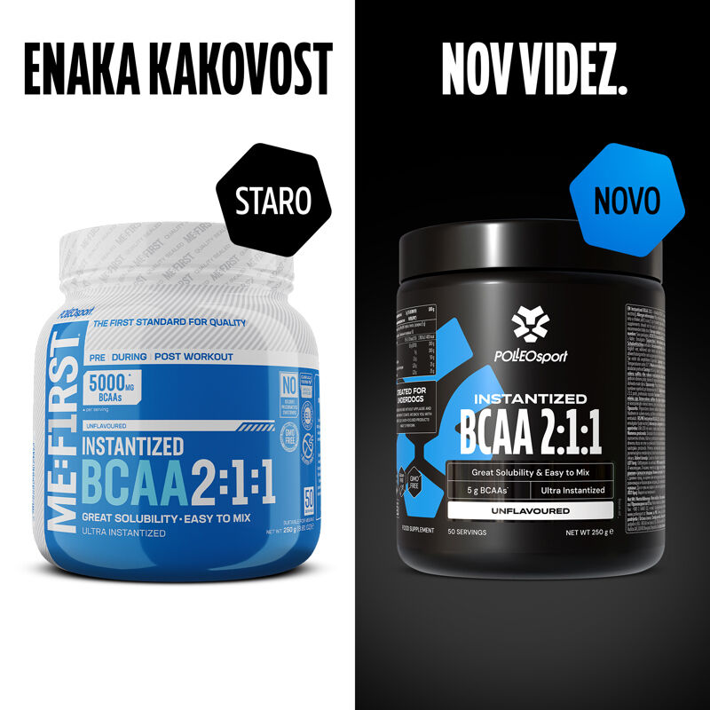 SI Instantized BCAA 2:1:1 - instantizirane BCAA 2:1:1, prehransko dopolnilo Sestavine: IBCAA [L-levcin, L-izolevcin, L-valin, emulgator (sončnični lecitin)], sredstvo za uravnavanje kislosti (citronska kislina). Alergeni: Lahko vsebuje sledi mleka, soje, jajc, listne zelene, sulfitov, rib, rakov in oreščkov. Navodila za uporabo: Nalijte 200 ml vode v shaker, dodajte 1 merico (5 g) prahu, dobro pretresite in konzumirajte enkrat dnevno po treningu. Navedba: Priporočene dnevne količine oziroma odmerka se ne sme prekoračiti. Shranjevati nedosegljivo otrokom!. Opozorilo: Priporočenih dnevnih odmerkov se ne sme prekoračiti. Shranjevanje: Hraniti na hladnem in suhem mestu, zaščiteno pred direktno sončno svetlobo, pri temperaturi do 25 °C. .
