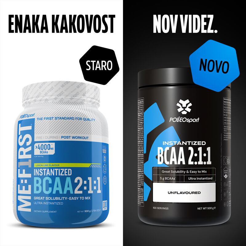 SI Instantized BCAA 2:1:1 - instantizirane BCAA 2:1:1, prehransko dopolnilo Sestavine: IBCAA [L-levcin, L-izolevcin, L-valin, emulgator (sončnični lecitin)], sredstvo za uravnavanje kislosti (citronska kislina). Alergeni: Lahko vsebuje sledi mleka, soje, jajc, listne zelene, sulfitov, rib, rakov in oreščkov. Navodila za uporabo: Nalijte 200 ml vode v shaker, dodajte 1 merico (5 g) prahu, dobro pretresite in konzumirajte enkrat dnevno po treningu. Navedba: Priporočene dnevne količine oziroma odmerka se ne sme prekoračiti. Shranjevati nedosegljivo otrokom!. Opozorilo: Priporočenih dnevnih odmerkov se ne sme prekoračiti. Shranjevanje: Hraniti na hladnem in suhem mestu, zaščiteno pred direktno sončno svetlobo, pri temperaturi do 25 °C. .