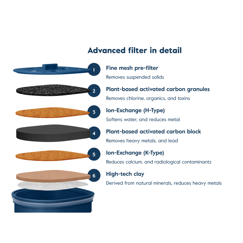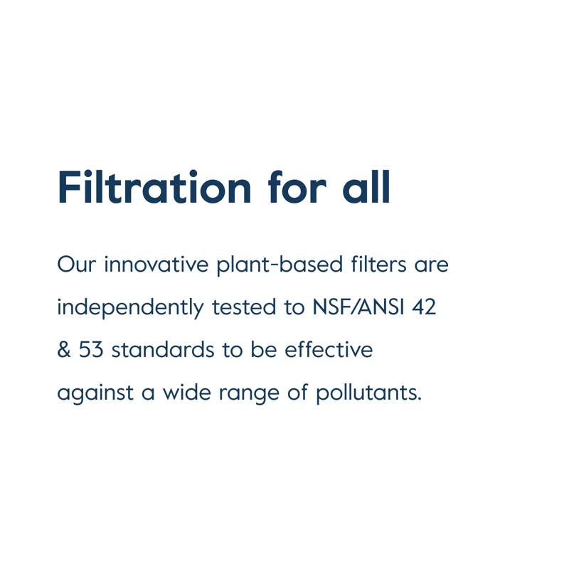 Naš filter na osnovi ogljika in rastlin odstranjuje neželene onesnaževalce, kot so svinec, živo srebro, klor, HAA5 in še več, kar vam omogoča, da uživate v čisti, sveže okusni vodi. Brez kompromisov.