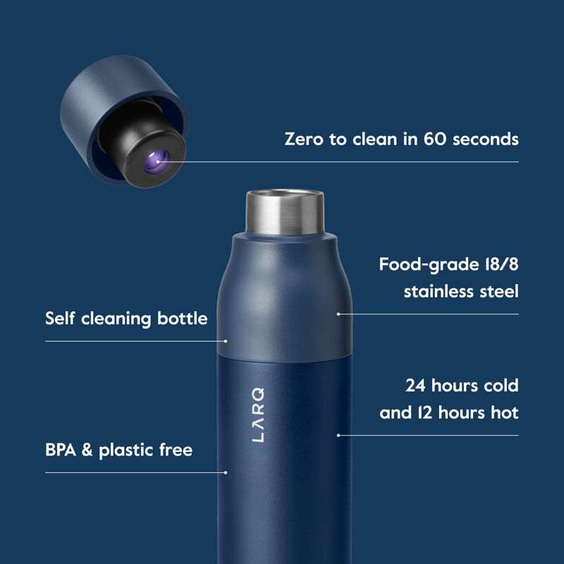 LARQ Steklenica PureVis™ je prva samodejno čistilna steklenica in sistem za prečiščevanje vode na svetu. Uporablja PureVis tehnologijo za odstranjevanje do 99%* bioloških onesnaževalcev, kot je E. coli, iz vaše vode in steklenice.
