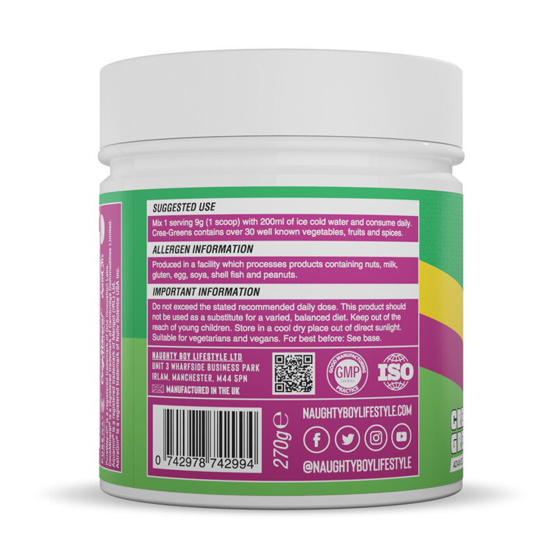 Okus: Passion Fruit Sestavine: Kreatin monohidrat, CocoMineral® kokosova voda v prahu [kokos (Cocos nucifera, sadje), nosilec (maltodekstrin)], magnezijev citrat (kot Aquamin® MG), rožnata himalajska sol, PureWayC® [L-askorbinska kislina, bioflavonoidi citrusov (Citrus spp., lupina)], MitoGreens [kvercetin, sredstvi proti sprijemanju (odporen dekstrin, silicijev dioksid), koncentrat ohrovta (Brassic oleracea var. acephala, nadzemni del), beli poper (Piper nigrum, semena), izvleček nageljnovih žbic (Eugenia caryophyllata, plod), izvleček zelenega čaja (Camellia sinensis, list), izvleček čebule (Allium cepa, cel. rastlina), izvleček acerole (Malphigia glabra, plod), izvleček mete (Mentha haplocalyx, list), izvleček rožmarina (Rosmarinus officinalis, list), izvleček vinske trte (Vitis vinifera, semena), izvleček karija (Murraya koenigii, plod), zgoščeni bezgov (Sambucus nigra, sadje), koncentrat manga (Garcinia mangostana, sadež), izvleček črnega ribeza (Ribes nigrum, sadež), izvleček borovnice (Vaccinium uliginosum, sadež), izvleček borovnice (Vaccinium myrtillus, sadež), koncentrat brstičnega ohrovta (Brassica oleracea, kalček), koncentrat brokolija (Brassica oleracea Linnaeus, kalček), izvleček jabolka (Malus pumila, plod), paradižnikov koncentrat (Lycopersicon esculentum, sadje), koncentrat brokolija (Brassica oleracea Linnaerus, popek), koncentrat camu camu (Myrciaria dubia, sadje), koncentrat česna (Allium sativum, čebulica), koncentrat origana (Origanum vulgare, list), koncentrat korenja (Daucus carota, koren), koncentrat češnje (Cerasus pseudocerasus, sadje), koncentrat malin (Rubus idaeus, sadje), koncentrat aronije (Aronia melanocarpa, sadje), koncentrat robide (Rubus fruticosus, sadje), L-ergotionein], AstraGin® [izvleček ginsenga (Panax notoginseng, korenina), izvleček membranskega kozlička (Astragalus membranaceus, korenina), nosilec (maltodekstrin)], aroma, sladilo (sukraloza), sredstva za uravnavanje kislosti (citronska kislina, jabolčna kislina), sredstvo proti sprijemanju (silicijev dioksid), bojilo (betanin).
