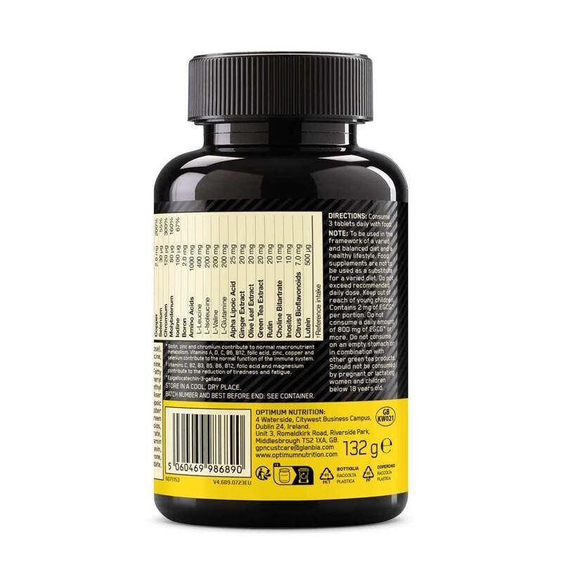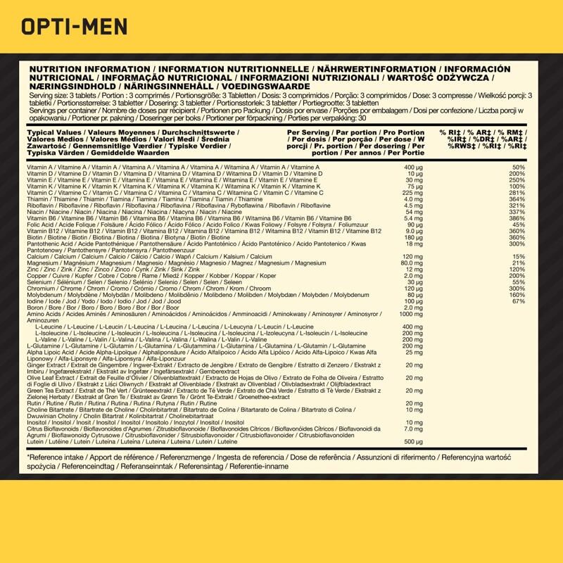 Sestavine: Sredstvo za povečanje prostornine (mikrokristalna celuloza), L-levcin, kalcijev karbonat, L-askorbinska kislina, L-izolevcin, L-valin, L-glutamin, sredstva proti sprijemanju (silicijev dioksid, magnezijeve soli maščobnih kislin, maščobne kisline), magnezijev oksid, DL-alfa-tokoferil acetat, stabilizator (zamrežen celulozni gumi), premaz [sredstvo za glaziranje (hidroksipropil metil celuloza), gostilo (glicerol)], nikotinamid, kalcijev D-pantotenat, alfa-lipoična kislina, rutin, kompleks citrusnih bioflavonoidov (standardiziran na 35 % flavonoidov), natrijev borat, izvleček zelenega čaja (Camellia sinensis, list), izvleček ingverja (Zingiber officinale, koren), izvleček oljke (Olea europaea, list), cinkov oksid, kromov (III) klorid, kromov pikolinat, L-holin bitartrat, inozitol, filokinon, bakrov sulfat, natrijev molibdat, piridoksin-hidroklorid, beta-karoten, L-selenometionin, tiamin-hidroklorid, manganov sulfat, riboflavin, holekalciferol, žametnica (Tagetes erecta, cvet, standardiziran na 10 % luteina), kalijev jodid, retinil-acetat, cianokobalamin, D-biotin, pteroilmonoglutaminska kislina.