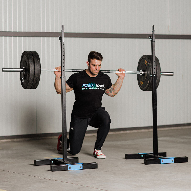 Polleo prilagodljivo stojalo za počepe predstavlja nov standard, ki kombinira stabilnost in moč narejenih iz najbolj kvalitetnega, strojno obdelanega jekla iz EU. Učinkovitost dizajna namenjenega visoko intenzivnem hardcore treningu. Naprava se hitro in enostavno zloži, trdnost stojala zagotavlja stabilnost in nosilnost 150kg.