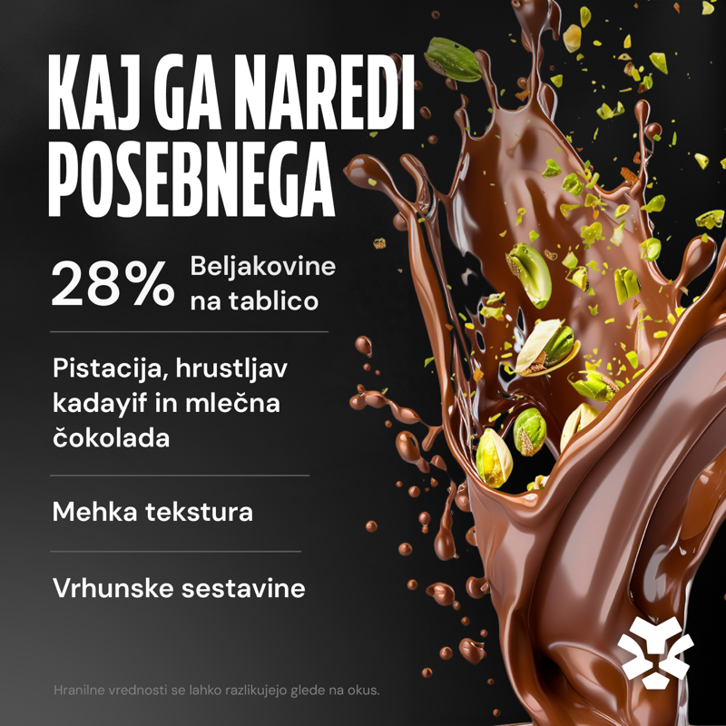 Dubai čokolada – sladica, ki je izjemno hitro osvojila ves svet – je zdaj na voljo tudi v proteinski različici! Edinstvena kombinacija popolnoma mehke pistacije in neustavljivo hrustljave kadayif sladice, oblita z najfinejšo mlečno čokolado, prepriča že z prvim ugrizom. S kar 14 grami beljakovin na čokoladico je to fit poslastica, ki se ji preprosto ni mogoče upreti!