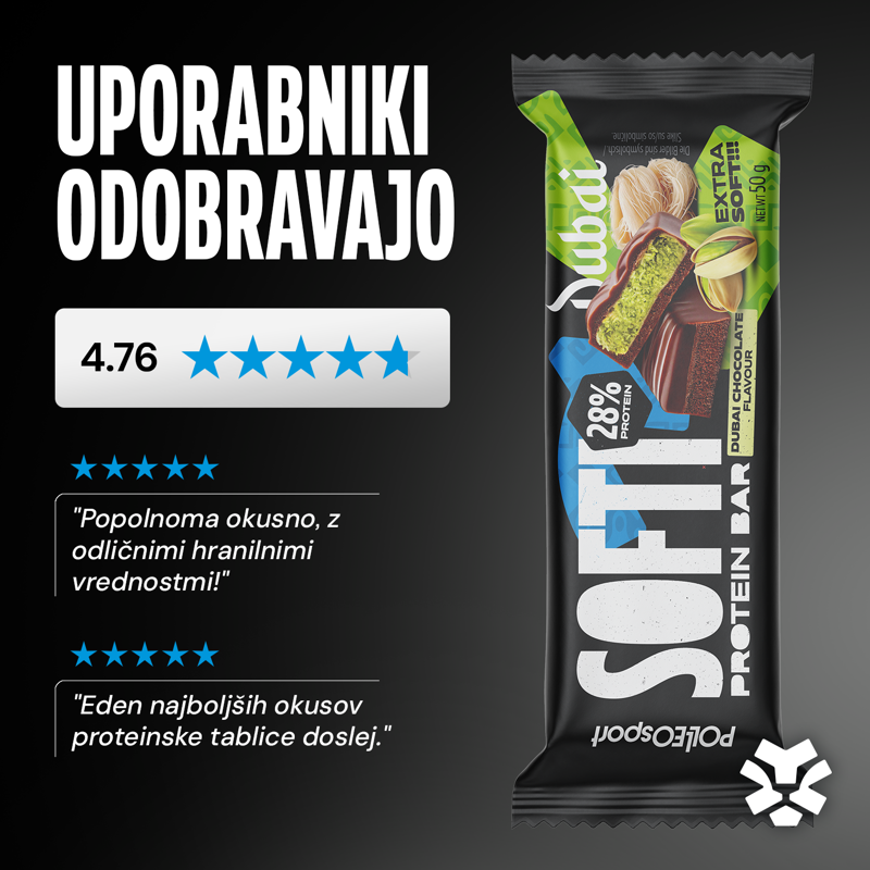 Pistacija, kadayif in čokolada – v edinstveni "soft" različici! Uživajte v izjemno mehki teksturi polnila, obogateni z visokokakovostnimi proteini, ki Softi Dubai čokoladico naredijo odlično izbiro za podporo okrevanju in rasti mišic po treningu, pa tudi kot hranilno bogato rešitev za potešitev lakote med obroki.