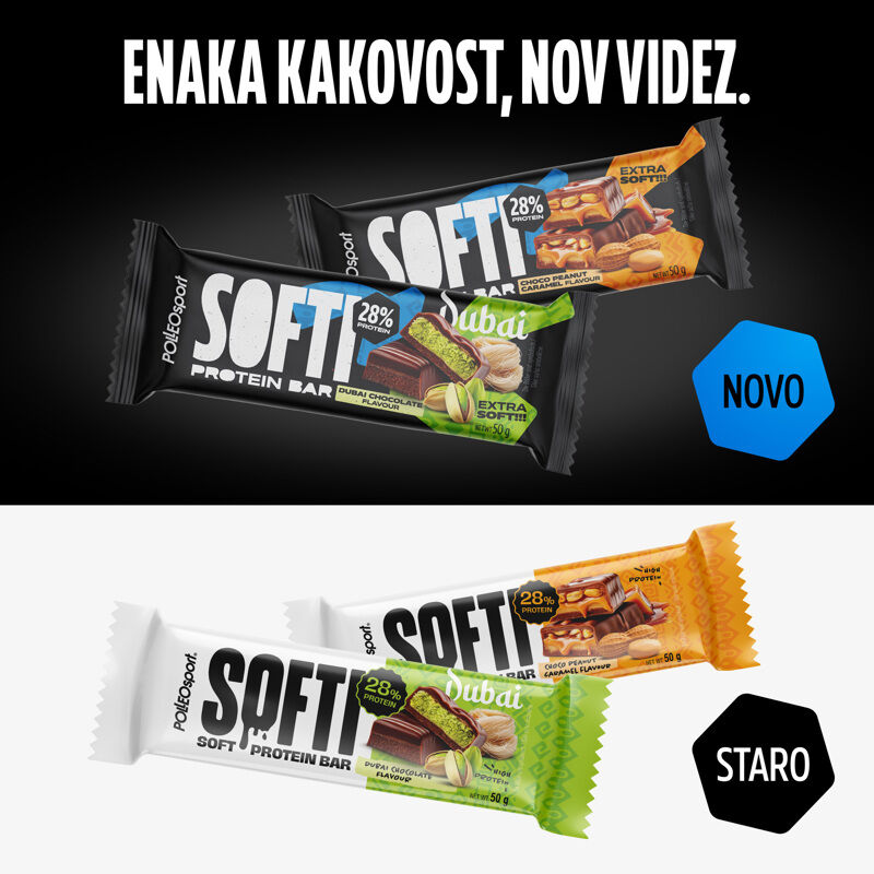 SI Softi - ploščica obogatena z beljakovinami s pistacijevim nadevom, kadayifom in prelivom z okusom mlečne čokolade, s sladkorjem in sladili. Sestavine: Preliv z okusom mlečne čokolade s sladilom {28%, sladilo (maltitoli], maščoba palminih koščic, kakavov prah, sladka sirotka v prahu (iz mleka], posneto mleko v prahu, emulgator [lecitin (soja)]}, sredstvo za ohranjanje vlage (glicerol), pistacijev nadev s sladili {12%, sladili (maltitoli, sorbitoli], rastlinsko olje (repično olje, sončnično olje, palmovo olje], kadayif [pšenična moka (gluten), voda], pistacijevo pasto, posneto mleko v prahu, sirotka v prahu (iz mleka], maslo (iz mleka], emulgatorja [lecitin (sončnica), poliglicerol poliricinoleat], karameliziran sladkor, jodirana sol, barvili (bakrovi kompleksi klorofilov in klorofilinov, karamel, kurkumin], antioksidant (alfa tokoferol], arome}, hidrolizirani peptidi kolagena [9%, živalskega izvora (goveje meso)], izolat sirotkinih beljakovin (9%, iz mleka), izolat sojinih beljakovin (7%), palmova maščoba, sončnično olje, sladili (sorbitoli, maltitoli), beljakovine volčjega boba, stabilizatorja (polidekstroza, ksantan gumi), posneto mleko v prahu, arome, kislina (askorbinska kislina), emulgator [lecitin (soja)], sredstvo za vzahajanje (natrijevi karbonati), sladilo (sukraloza). Alergeni: Lahko vsebuje sledi oreščkov in žit ki vsebujejo gluten. Opozorilo: Prekomerna uporaba lahko povzroči odvajalni učinek. Shranjevanje: Skladujte na chladnom, tmavom a suchom mieste do 22°C. Uporabno najmanj do / LOT broj: Odtisnjeno na embalaži.
