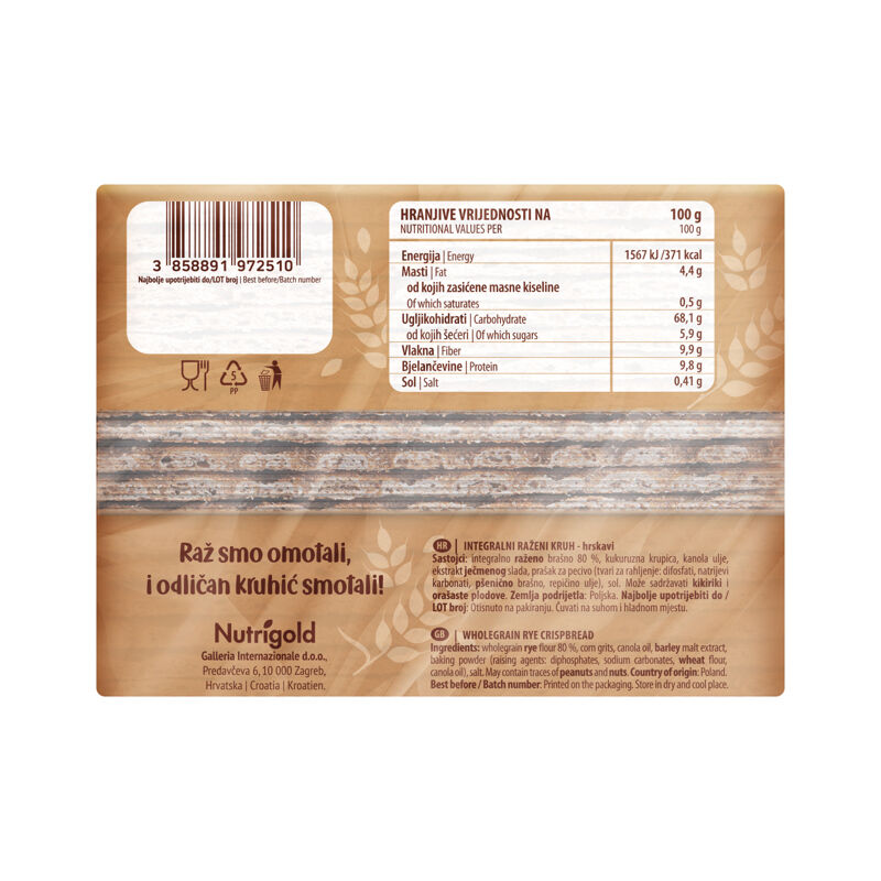 Nutrigold polnozrnati hrustljavi ržene kruhke kombinirajte s svojim priljubljenim namazom, s slastnim džemom ali kot prilogo za ene vaših priljubljenih jedi.