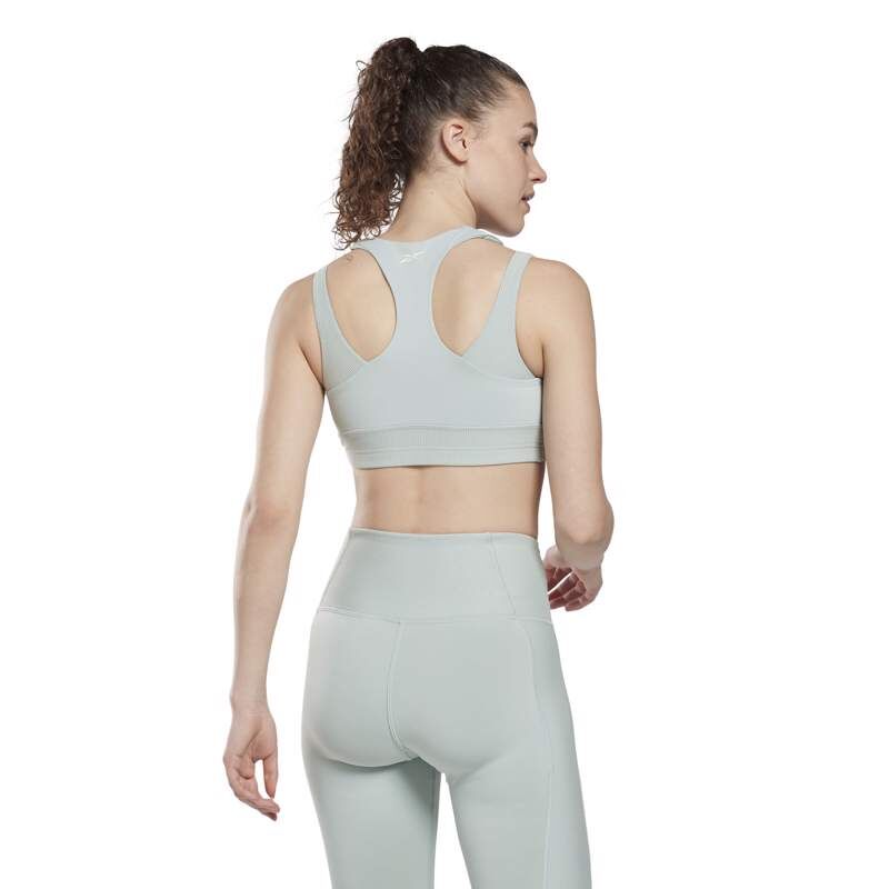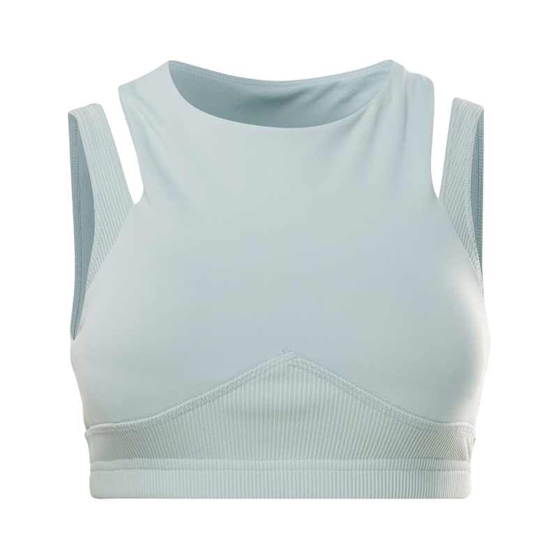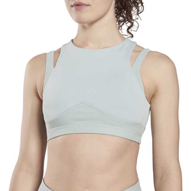 This women's Reebok bra top lets you rock a stylish layered look without the bulk. Made of soft, stretchy knit, it has a ribbed hem for a subtle textured effect. Built-in pads give you a held-in feel. The high neckline adds coverage for confidence in any workout.