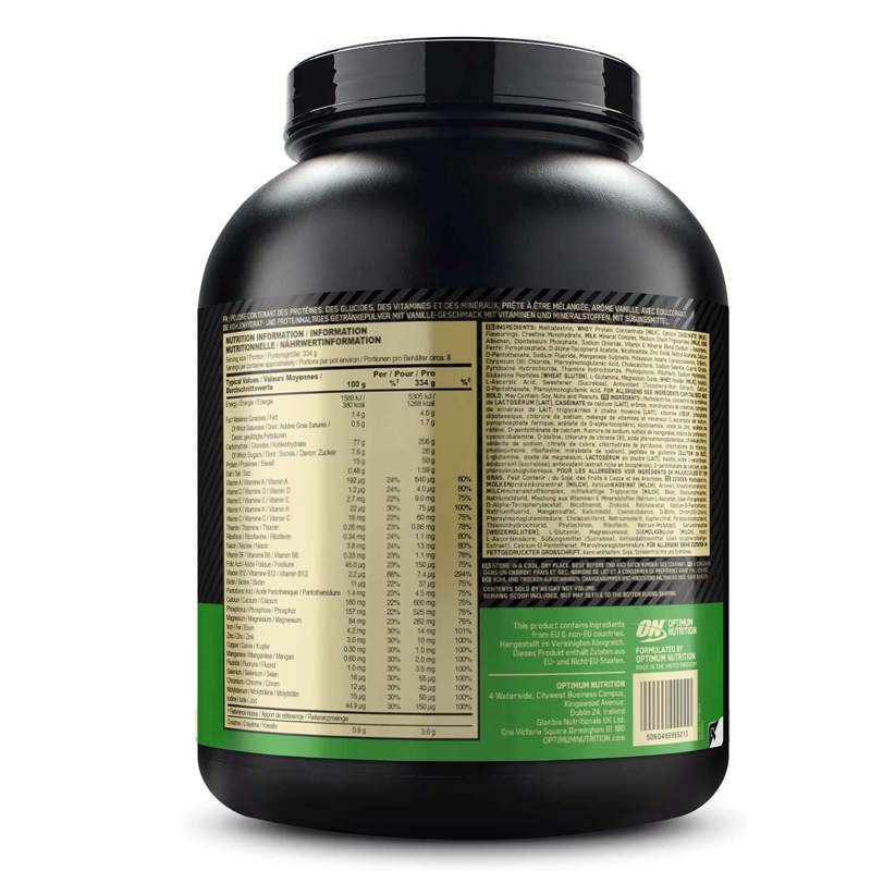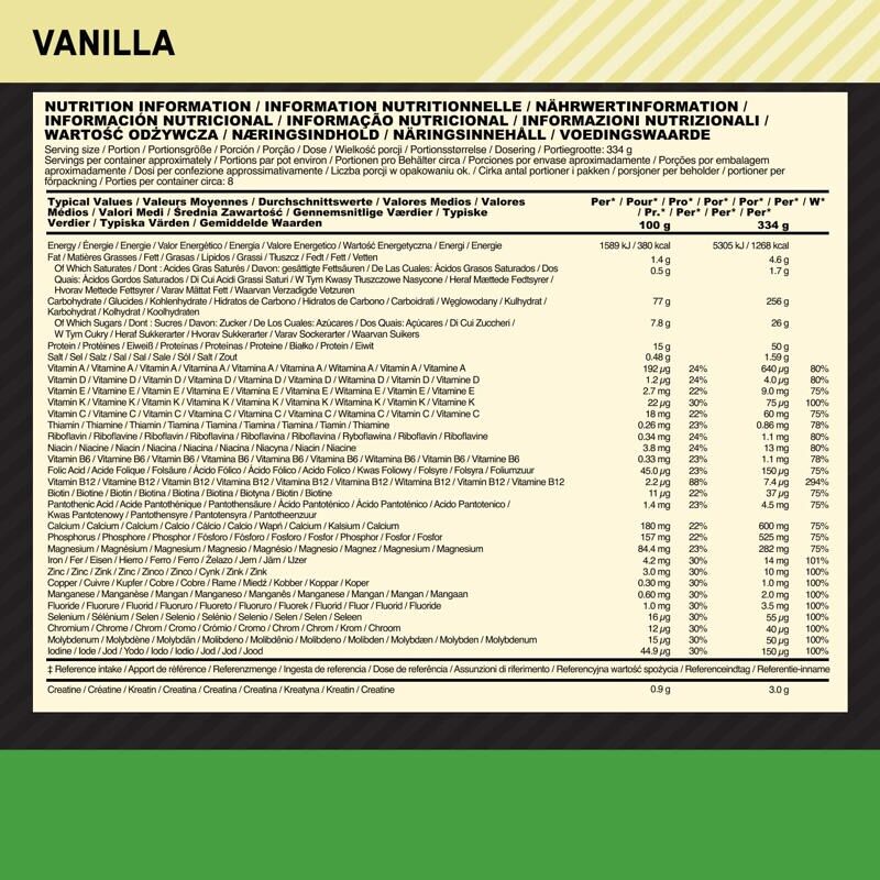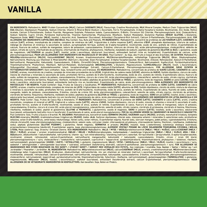 SESTAVINE: Koruzni maltodekstrin, beljakovinski koncentrat SIROTKE [MLEKO] (emulgator: lecitin [SOJO]), arome, drobtine piškotov (1,5 %) (PŠENIČNA moka [GLUTEN], sladkor, rastlinske maščobe: palmova, repična; kakav v prahu z manj maščobe, sol), kreatin monohidrat, MLEČNI mineralni kompleks [MLEKO], sol, minerali (magnezij, železo, cink, mangan, fluorid, selen, jod, baker, molibden, krom), vitamini (C, E, B3, A, B5, B7, B12, B9, D, B6, B1, K, B2), stabilizatorji (celulozni gumi, guar gumi, karagenan), sladilo (sukraloza).
