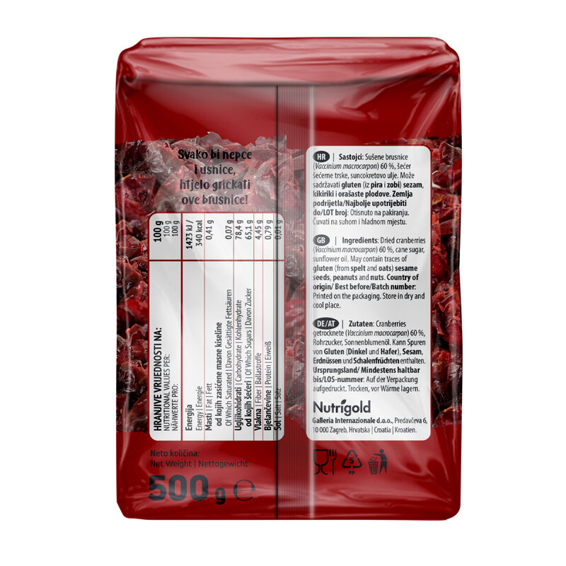 Sestavine: Posušene brusnice (Vaccinium macrocarpon), trsni sladkor, sončnično olje