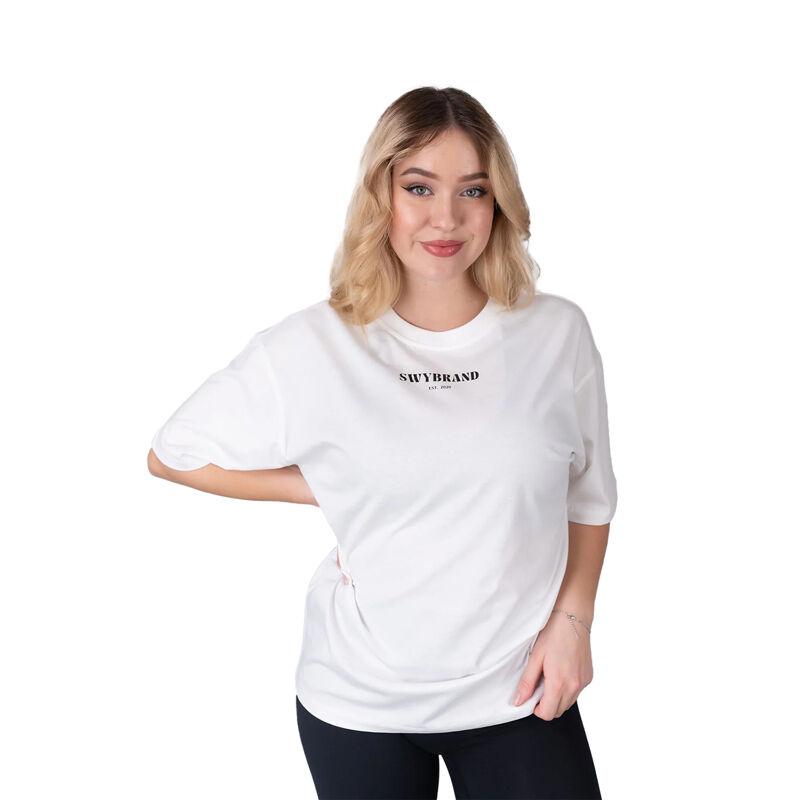Ta oversized majica je izdelana iz mehkega bombaža in ima sproščen kroj s spuščenimi rokavi. Ima okrogel izrez, nežen trikotni detajl na hrbtni strani in napis spredaj, ki doda športni pridih.