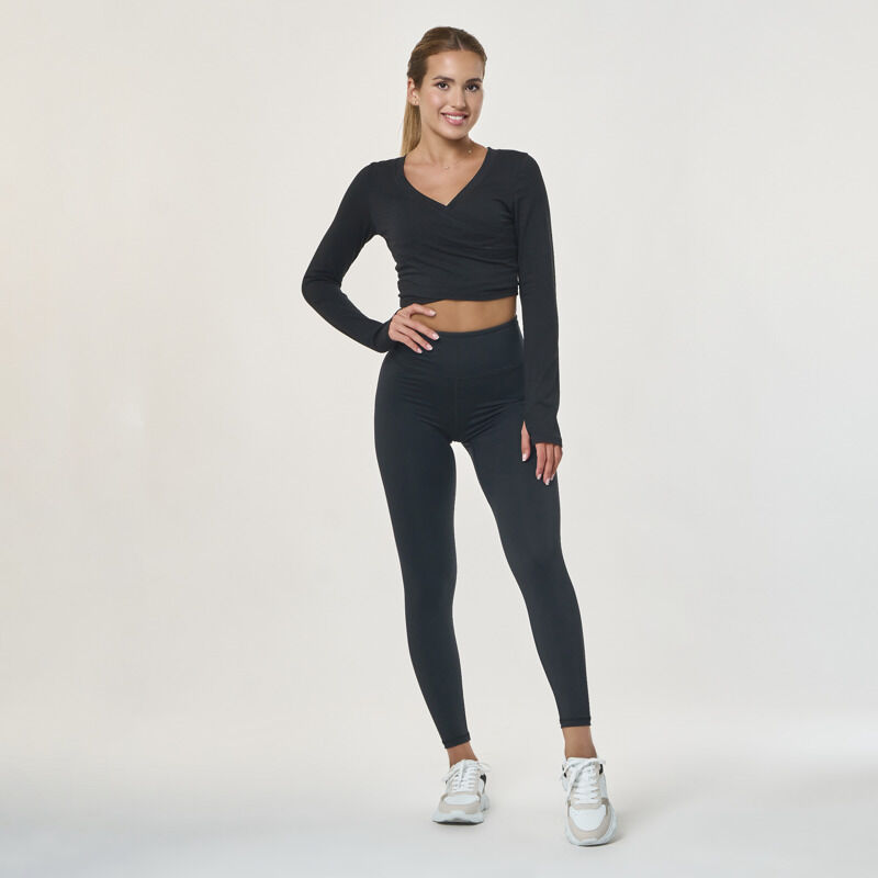 Hitro in enostavno do zapeljivega videza s Thora topom – stiliziranim topom s preklopljenim dekoltejem in dolgimi rokavi. Na voljo je v črni barvi, ki je vedno moderna in jo boš zlahka uskladila s preostalo garderobo. Enostavnost in vsestranskost tega modela zagotavlja nosljivost v vseh priložnostih – od joge in plesa do večernih izhodov.