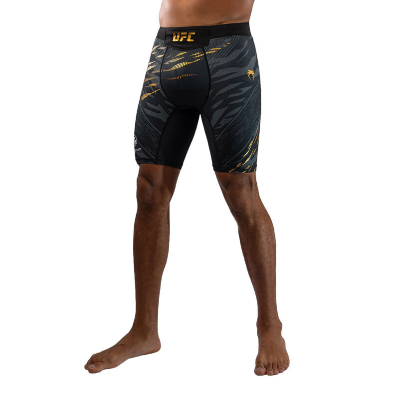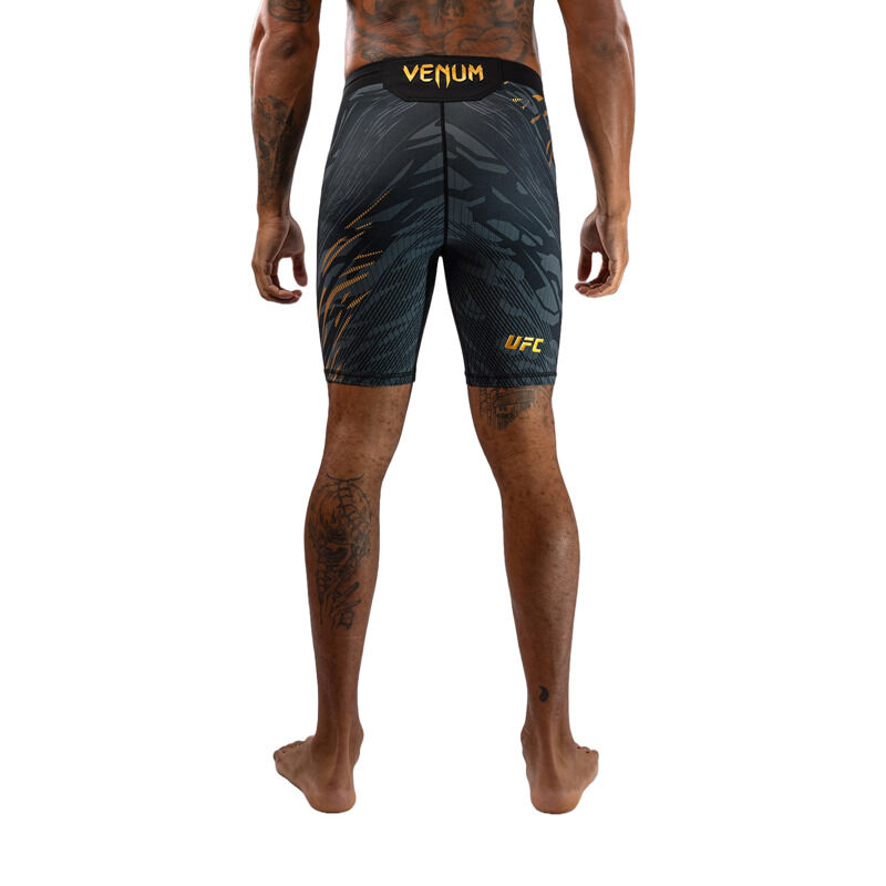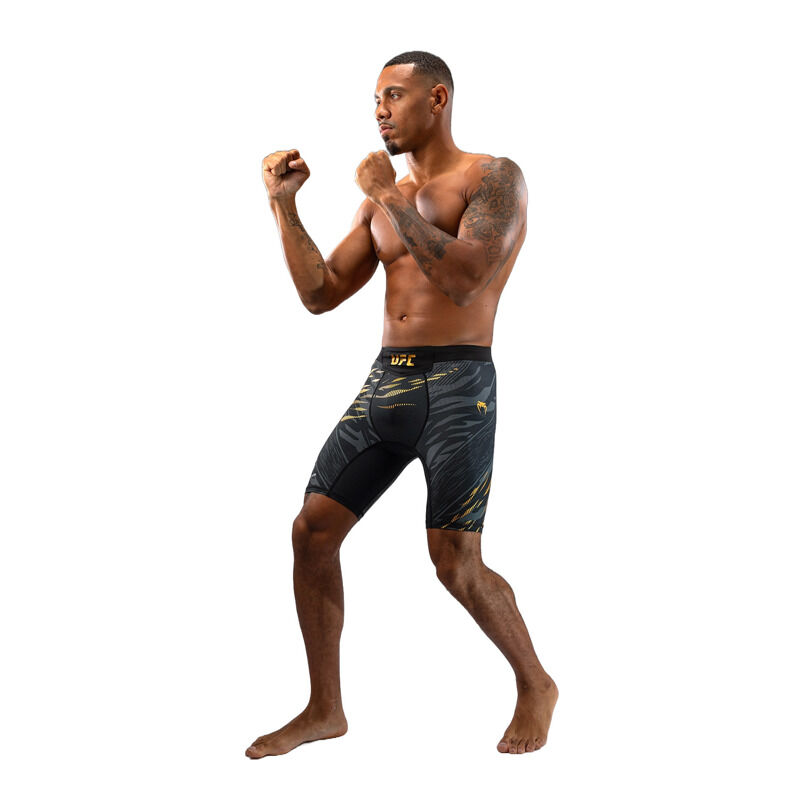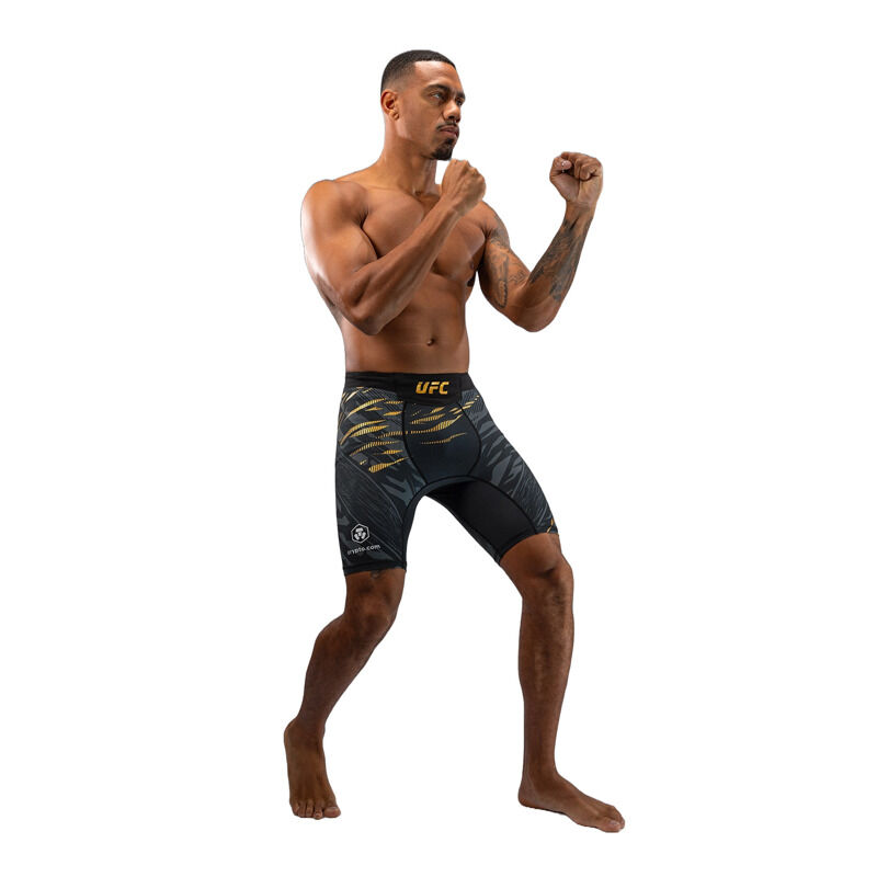 Predstavljamo UFC Fusion by Venum, celotno kolekcijo oblačil in dodatkov, ki združuje sofisticirane funkcionalne tkanine in prvinske oblikovalske elemente. Vsak kos iz te pristne UFC Fight Night kolekcije je bil zasnovan, da zadostuje potrebam UFC borcev, z uporabo izjemno vzdržljivih, zračnih tkanin in premišljeno zasnovanih detajlov. Jacquard živalski vzorec spodbuja športnike, da se povežejo s svojimi najglobljimi prvinskimi instinkti za zmago v Oktagonu. Zasnovane za gibljivost in udobje, te kratke hlače do sredine stegen v črno-zlati barvi imajo termalno lepljene stranske razpoke za večjo svobodo gibanja pri stoji in borbi na tleh. Tkanina je lahka, vzdržljiva in fleksibilna, medtem ko elastičen pas zagotavlja varno nošenje – popolne hlače za borilne športe. Ko so vložki najvišji, pojdite s prvinskimi instinkti.