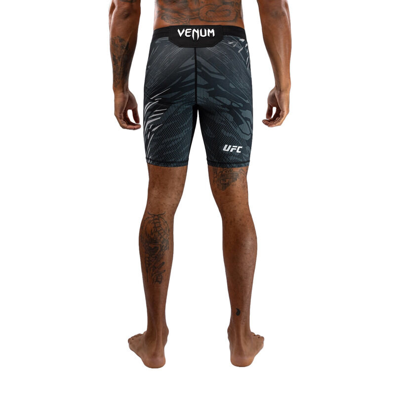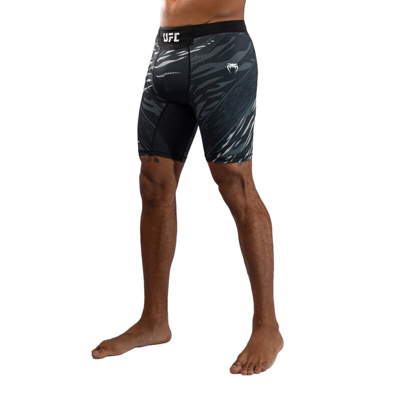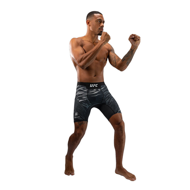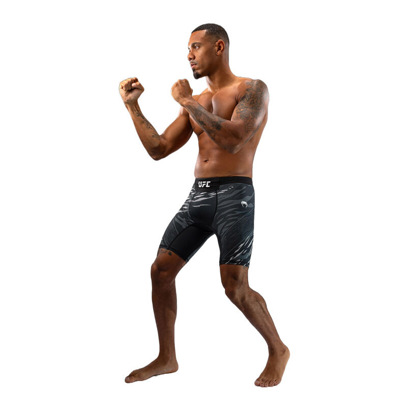 Predstavljamo UFC Fusion by Venum, celotno kolekcijo oblačil in dodatkov, ki združuje sofisticirane funkcionalne tkanine in prvinske oblikovalske elemente. Vsak kos iz te pristne UFC Fight Night kolekcije je bil zasnovan, da zadostuje potrebam UFC borcev, z uporabo izjemno vzdržljivih, zračnih tkanin in premišljeno zasnovanih detajlov. Jacquard živalski vzorec spodbuja športnike, da se povežejo s svojimi najglobljimi prvinskimi instinkti za zmago v Oktagonu. Te Vale Tudo hlače v črni barvi so idealne za treniranje različnih borilnih športov, izdelane pa so iz rahlo kompresijske mešanice tkanin, ki zagotavljajo tako podporo kot tudi svobodo gibanja. Zmeren kompresijski učinek pomaga pri izboljšanju krvnega obtoka in pospeši okrevanje. Ko so vložki najvišji, pojdite s prvinskimi instinkti.