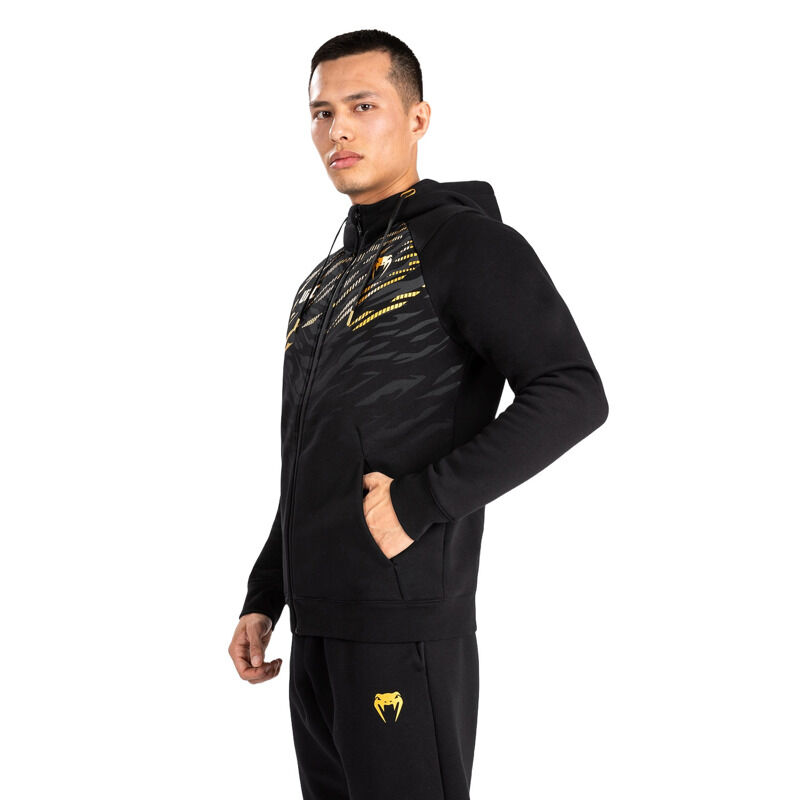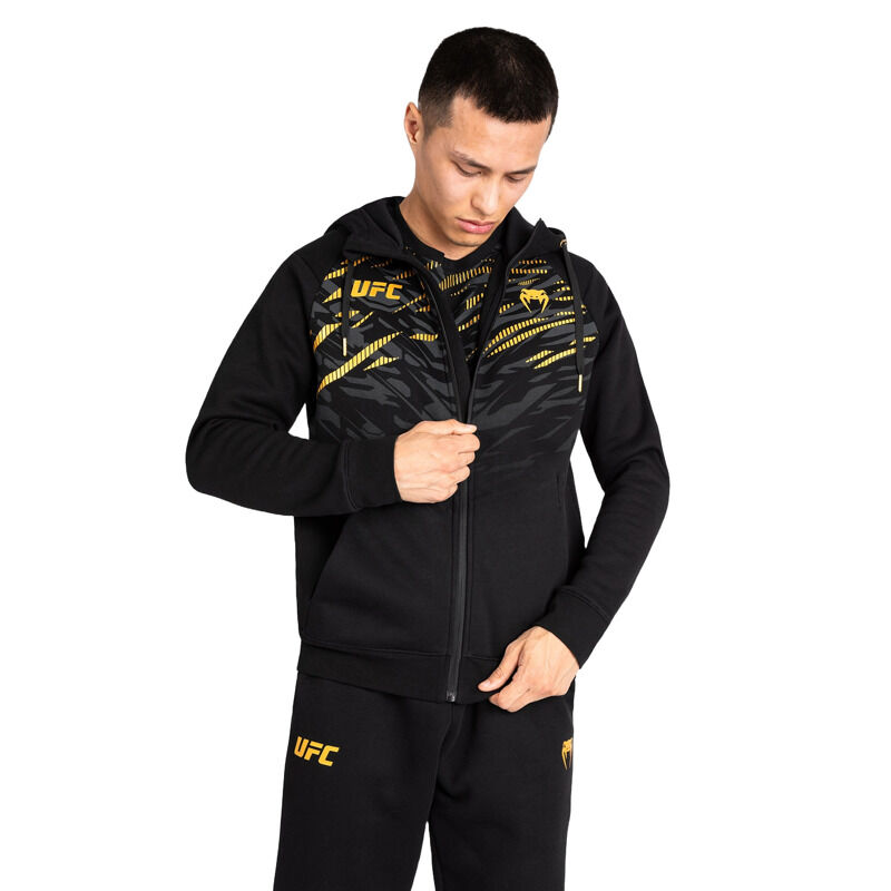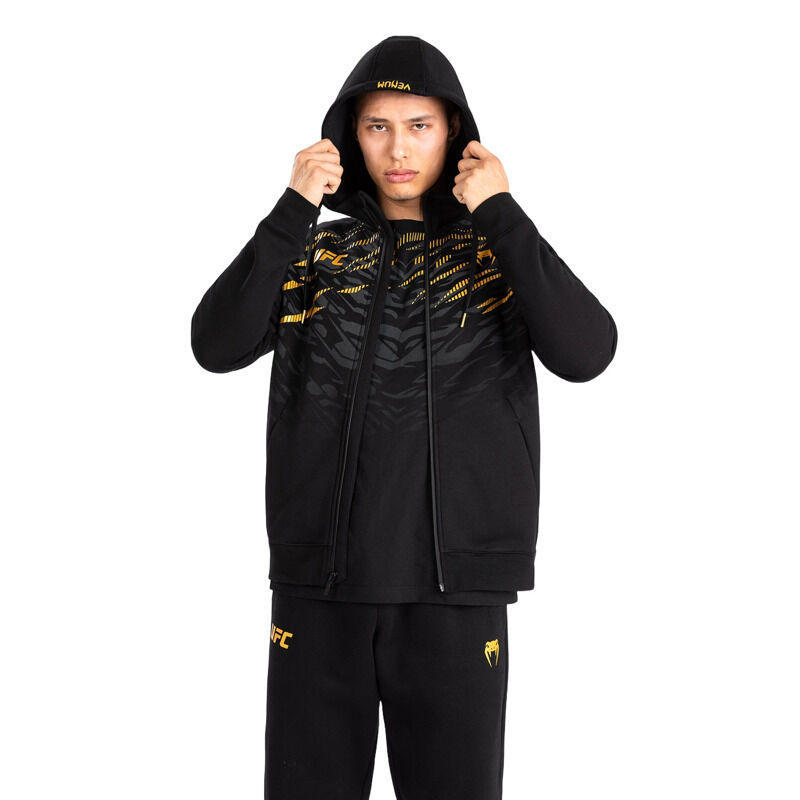 Navdihnjena z oblačili UFC borcev, kolekcija UFC Fusion by Venum Replica je idealna za oboževalce in borce. Dinamičen živalski vzorec v kolekciji spodbuja povezovanje z najglobljimi instinkti za zmago. UFC Fusion by Venum moški replica hoodie ima sprednji kengurujski žep in kapuco z vrvico. Detajli z logotipi Venum in UFC so nameščeni na prsih in kapuci. Ekskluzivna črno-zlata barvna kombinacija je namenjena UFC prvakom. Na voljo v dveh barvah, odlično se ujema z drugimi izdelki iz kolekcije.