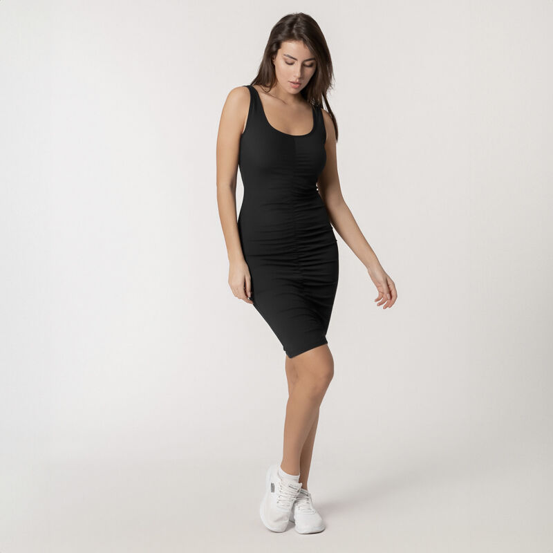 Ta obleka je narejena iz visokokakovostnega italijanskega materiala, zato daje prijeten občutek na koži, ki zagotavlja maksimalno udobje. Izjemna raztegljivost materiala zagotavlja zelo enostavno oblačenje, z občutkom lahkotnega in nemotenega gibanja skozi ves dan. Obleka je na voljo v klasični črni barvi, odlična izbira za različne priložnosti in stile.